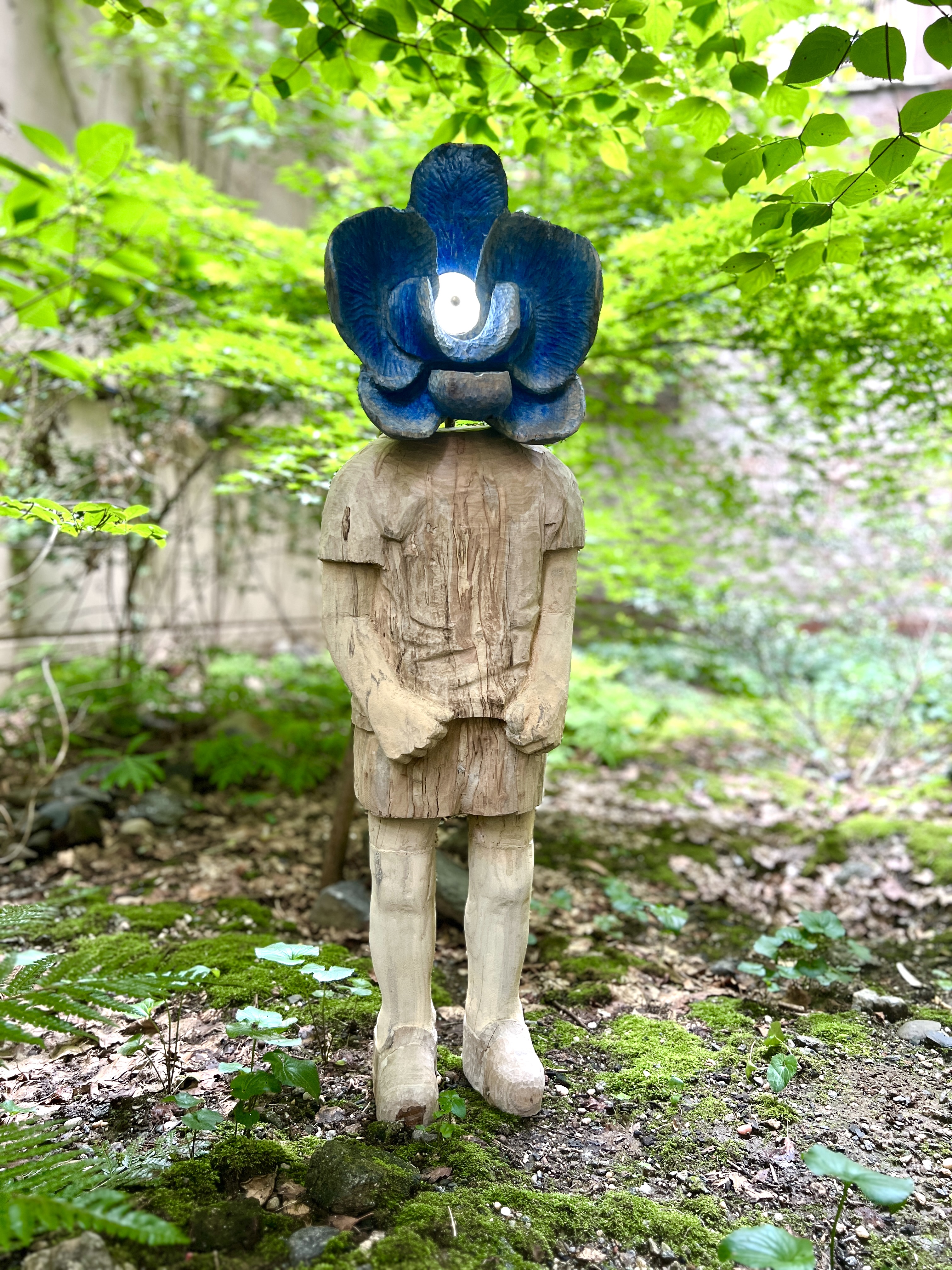 The Tenderness of Being Known is a wood carved life-size boy figure with a blue flower head that operates as a touch-responsive light. This work explores intimacy as something that emerges through interaction rather than observation.